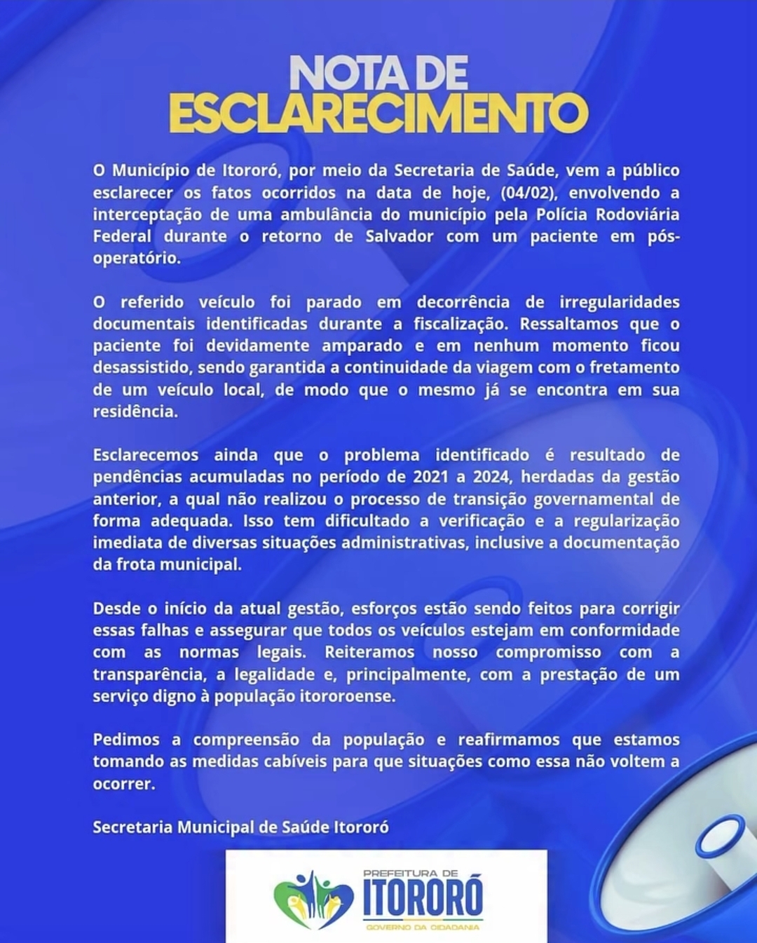 A Prefeitura de Itororó, por meio da Secretaria Municipal de Saúde, divulgou uma nota de esclarecimento horas após o fato, afirmando que o paciente não ficou desassistido em momento algum e que a continuidade da viagem foi garantida com o fretamento de um veículo local.