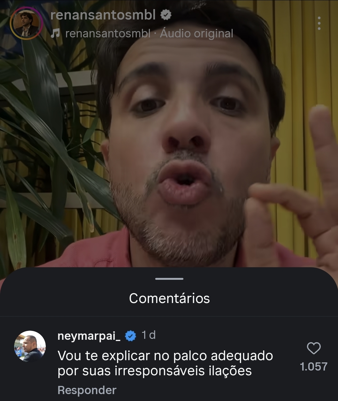 A resposta veio por meio de comentário nas redes sociais. Neymar pai escreveu: “Vou te explicar no palco adequado por suas irresponsáveis ilações”. A frase foi interpretada como sinalização de que o assunto será tratado judicialmente.