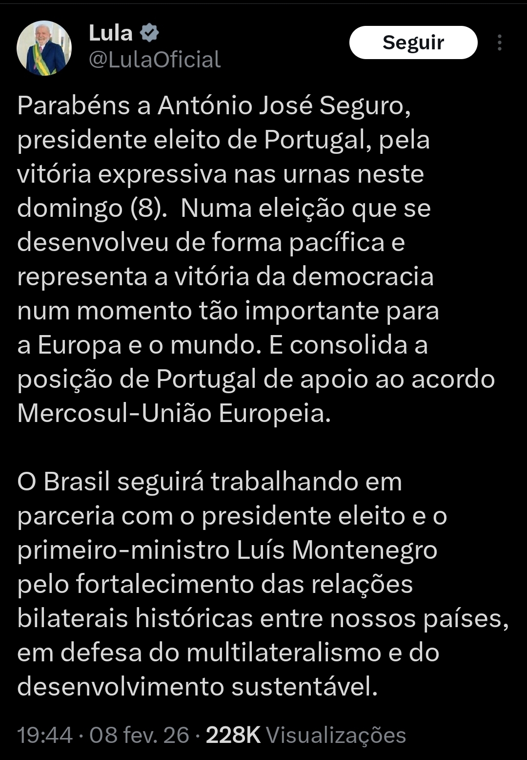 O Partido dos Trabalhadores (PT) parabenizou a vitória do candidato de esquerda António José Seguro nas eleições presidenciais de Portugal, destacando a derrota da extrema direita e a defesa da democracia e da justiça social.